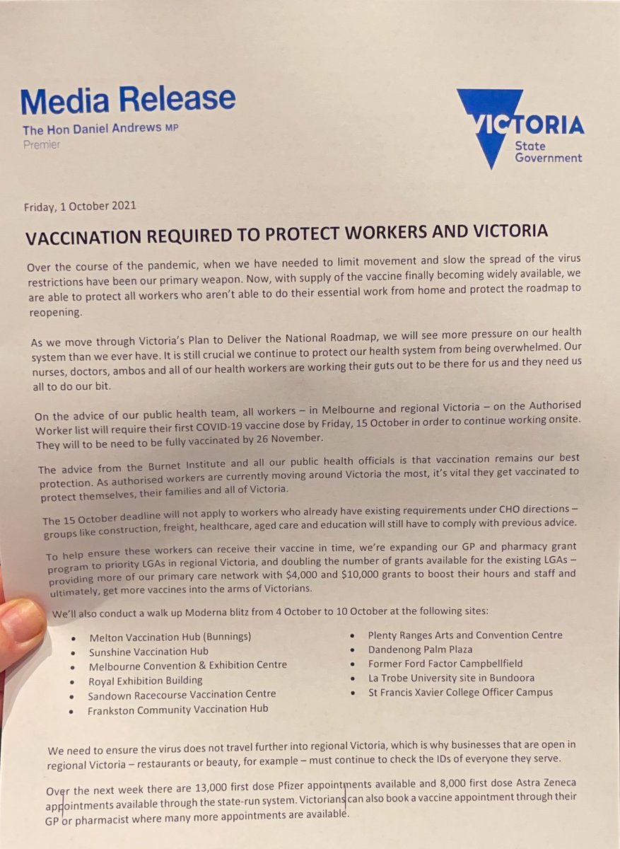 Victoria announces vaccine mandate for authorised workers as state reports 1143 new local COVID-19 cases dalecrudden 9 hours ago To keep the state away from the blockade the Prime Minister announced that by Friday October 15 all licensed workers throughout Victoria must have been vaccinated at least once. Mandatory vaccines for authorised workers in Victoria. A more polite sub for less civilised times.